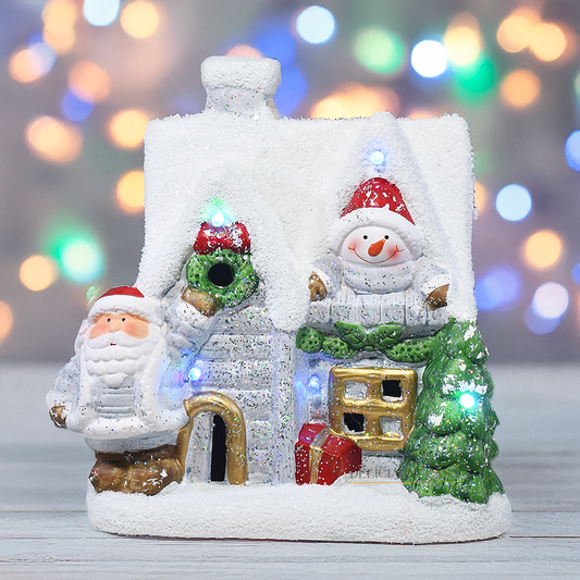 Casa Decorativa de Natal com Papai Noel e Boneco de Neve 22 cm – Enfeite Natalino Luz Led