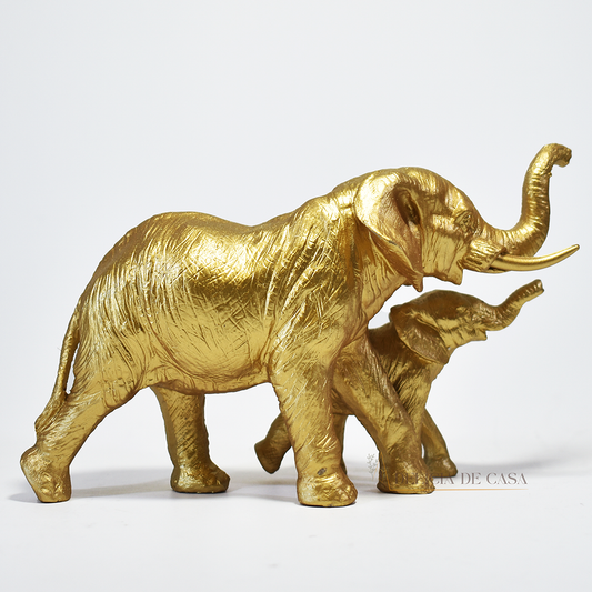 Escultura Decorativa Elefante com Filhote em Resina Dourada – Símbolo de Sorte e Proteção