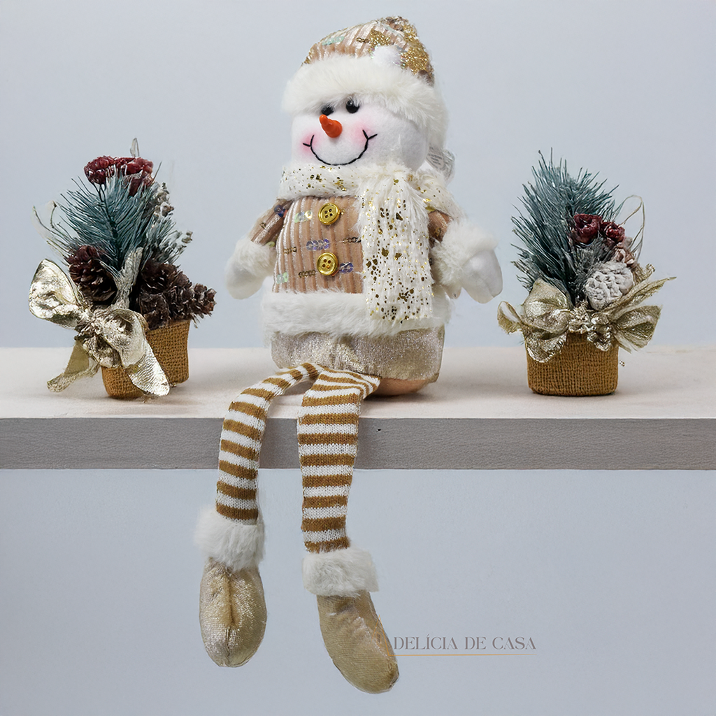 O Papai Noel Sentado apresenta barba branca fofa, gorro decorado e pernas longas listradas, ideal para ser colocado em prateleiras, aparadores, mesas ou até mesmo nos degraus da escada, criando um toque lúdico e aconchegante. Já o Boneco de Neve Sentado traz a mesma proposta, com detalhes festivos que remetem à magia do Natal e completam a coleção de forma encantadora.